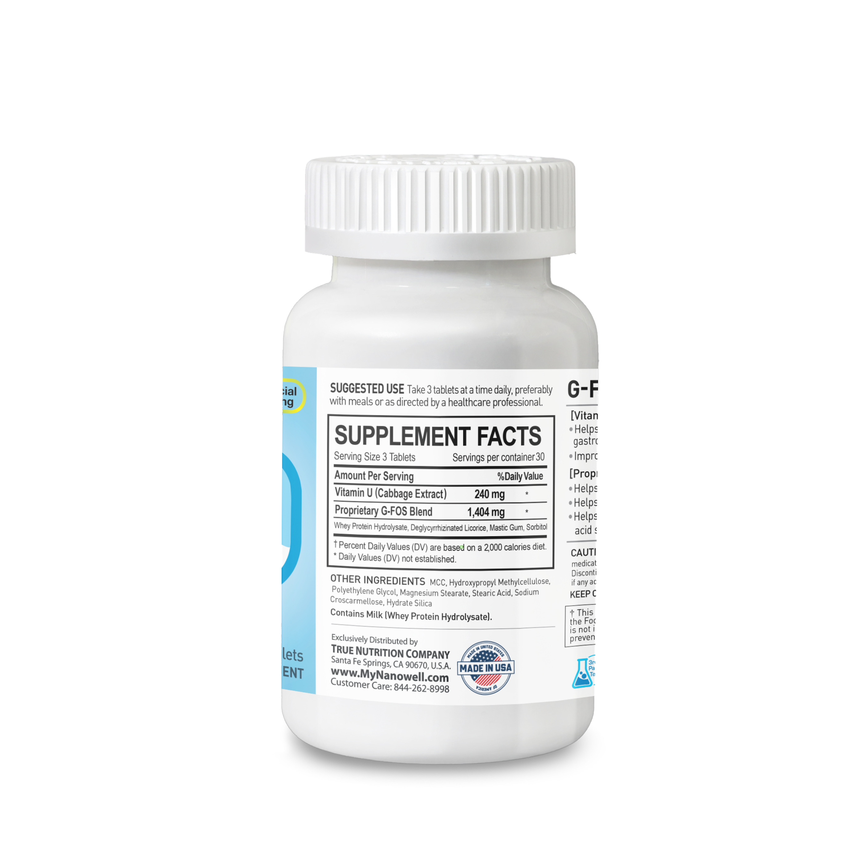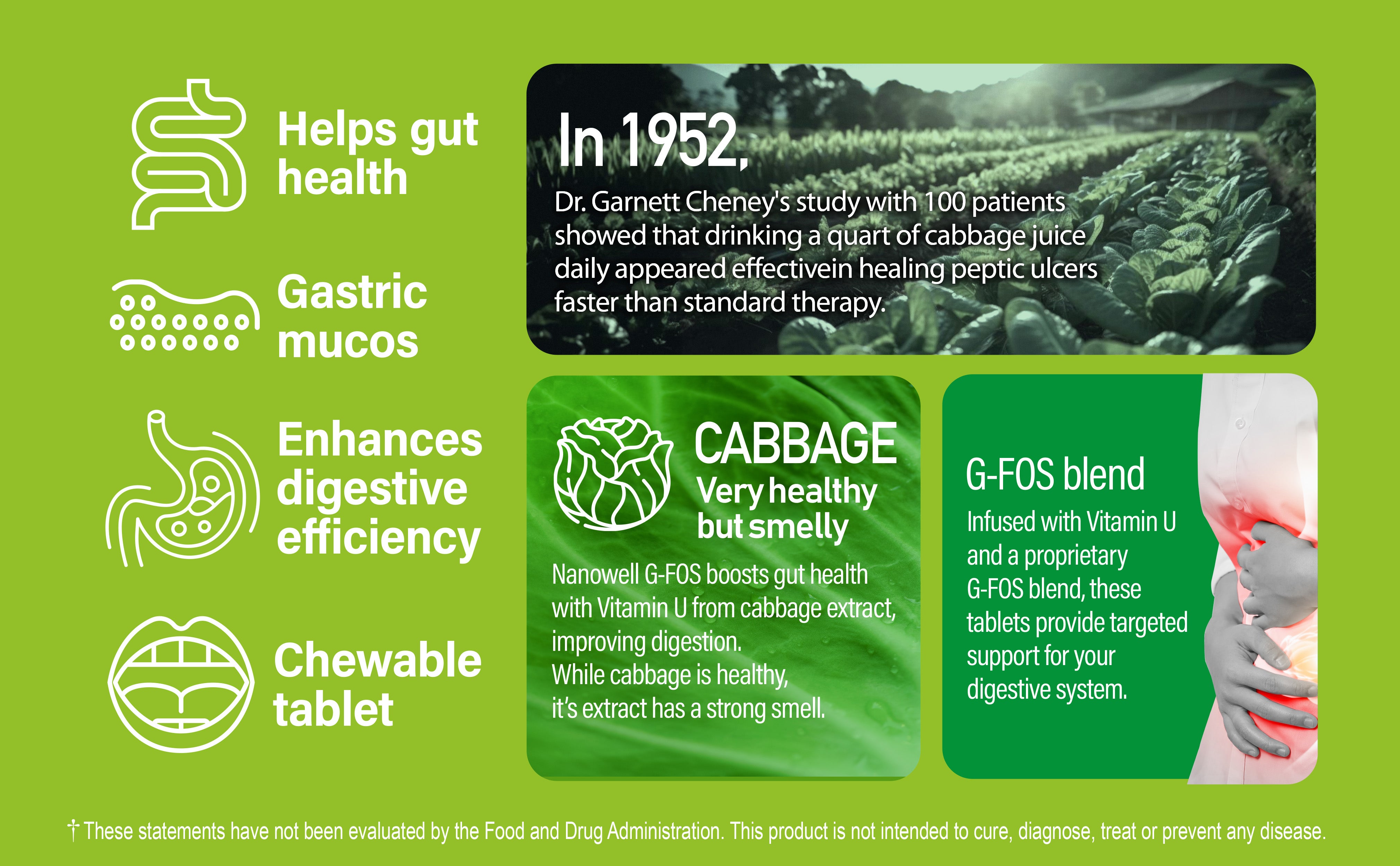 나노웰 G-FOS는 위장 건강과 웰빙을 촉진하는 종합적인 솔루션으로, 편리하게 씹어 섭취하는 타블렛 형태로 제공됩니다. 이 타블렛은 비타민 U와 자체 개발된 G-FOS 블렌드가 특별한 소화 시스템 지원을 제공하여 향상시켰습니다.