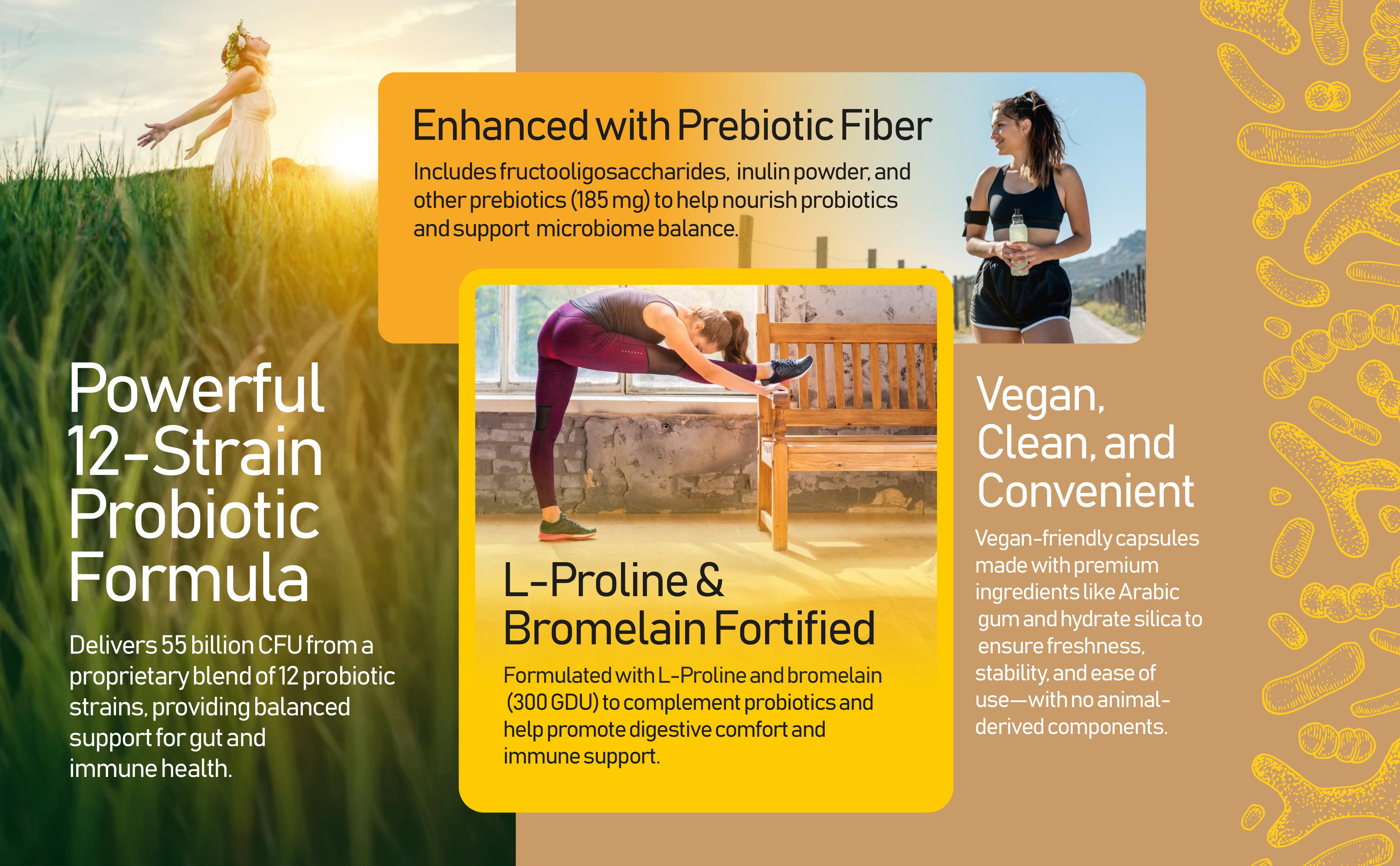 - 185mg 프리바이오틱스 섬유질 블렌드: 프락토올리고당, 자일로올리고당, 갈락토올리고당, 이눌린 파우더를 포함하여 프로바이오틱스를 영양 공급하고 장내 균형을 촉진합니다.