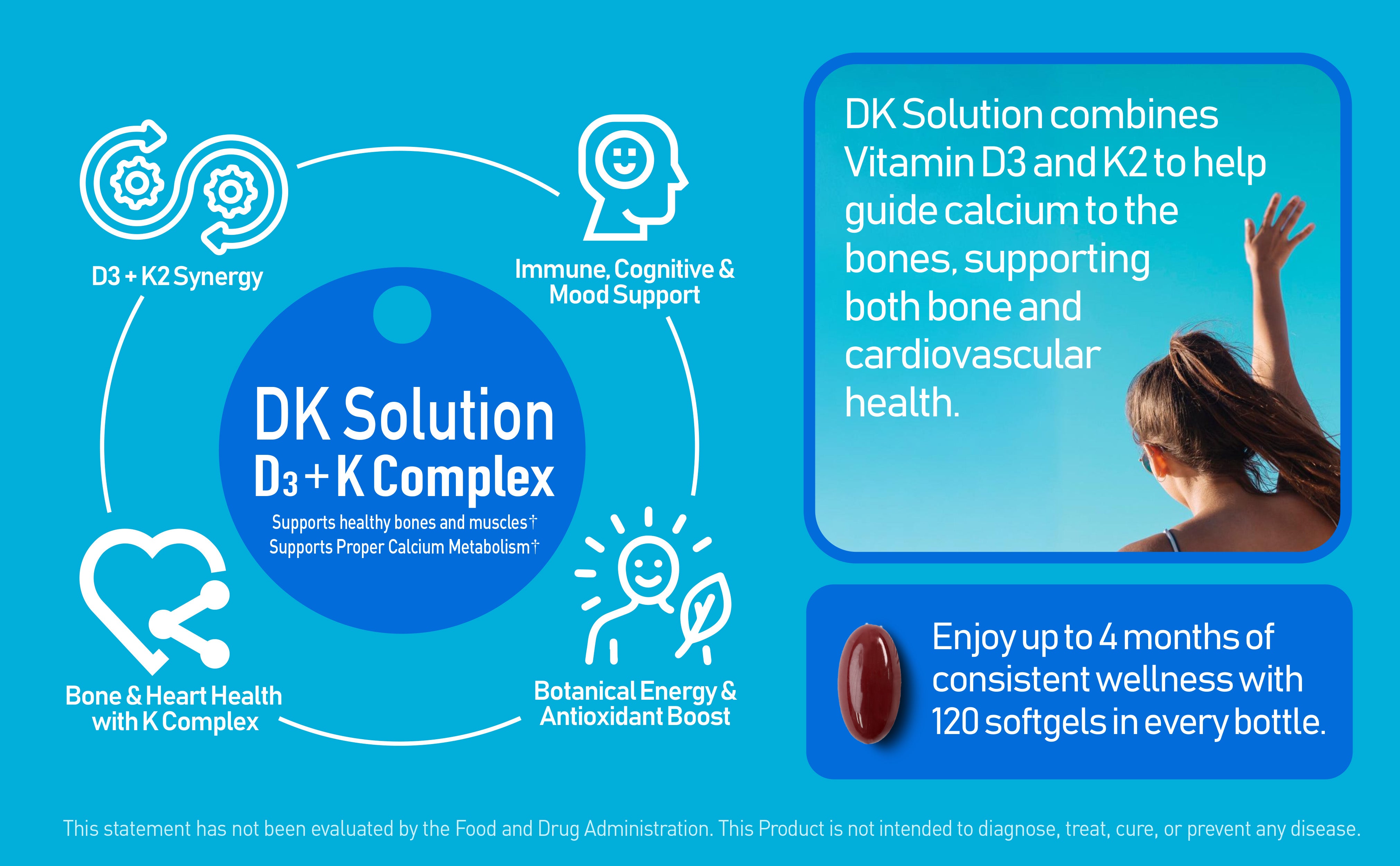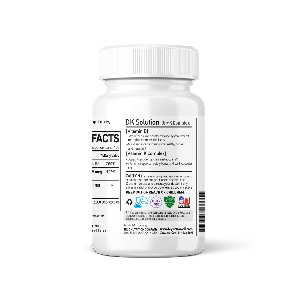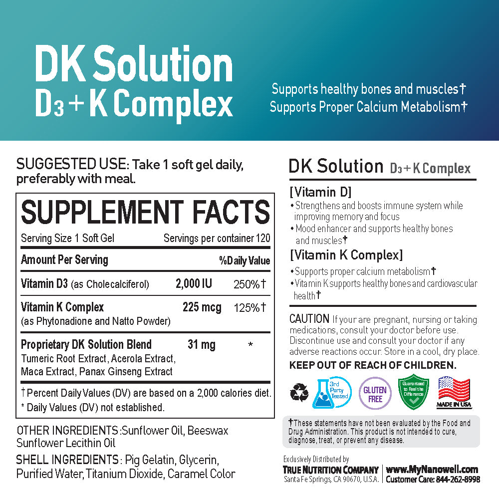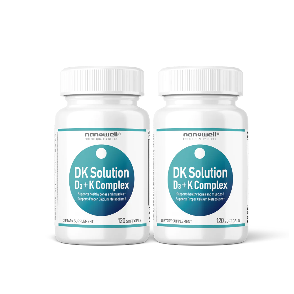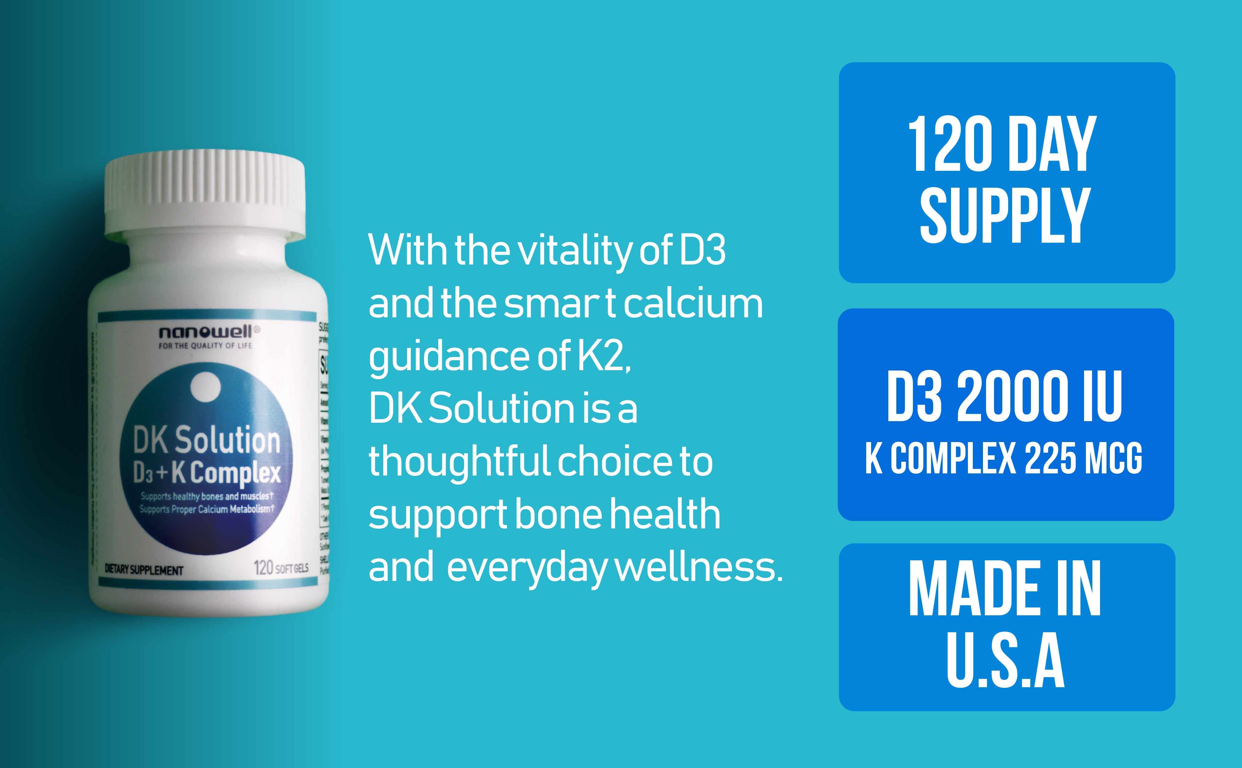 This NANOWELL DK Solution supplement provides 250% of Daily Value of Vitamin D3 (2,000 IU), 125% of Daily value of Vitamin K (225 mcg) and 31 mgs of a Proprietary DK Solution Blend is an excellent addition to my diet for healthy bones, muscles and provides calcium metabolism support. The supplements are quite small and extremely easy to swallow. Each bottle contains 120 gel tablets, and the recommended dose is just one, which gives each bottle enough supplement for four months. From all I have researched on this product, it is a quality product that I recommend.