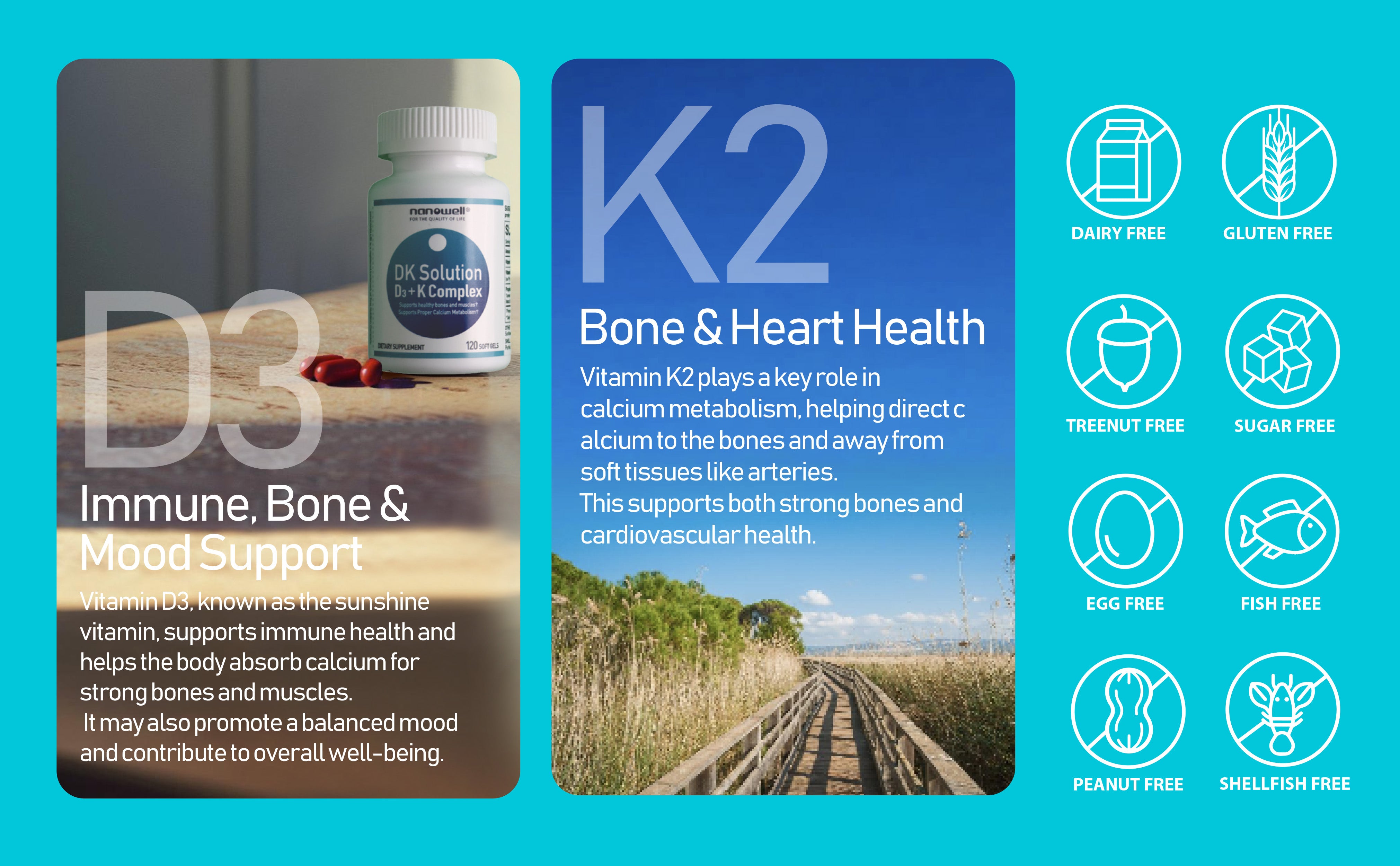 나노웰 DK 솔루션은 편리한 소프트젤 형태로 비타민 D3와 비타민 K 복합제제입니다. 필수 비타민들이 지원하는 면역 시스템, 인지 기능, 감정조절, 뼈 건강 및 전반적인 웰빙의 혜택을 경험해보세요.