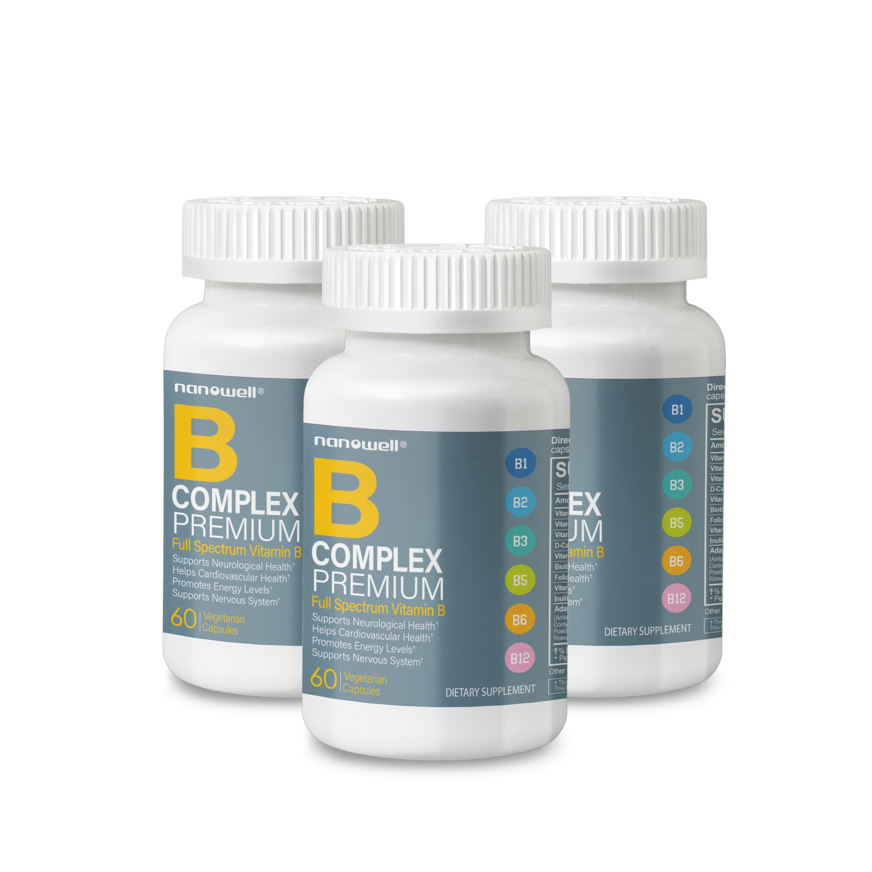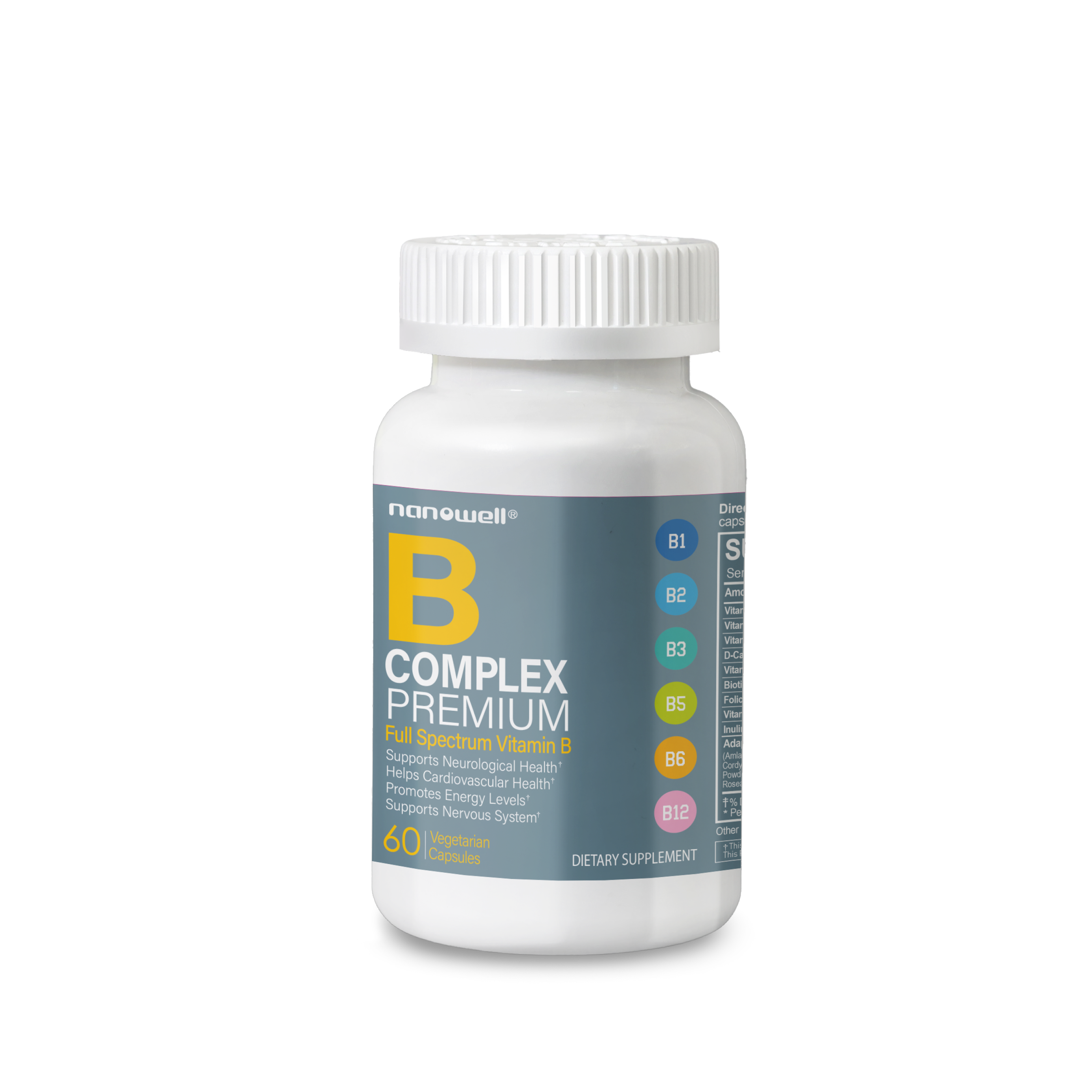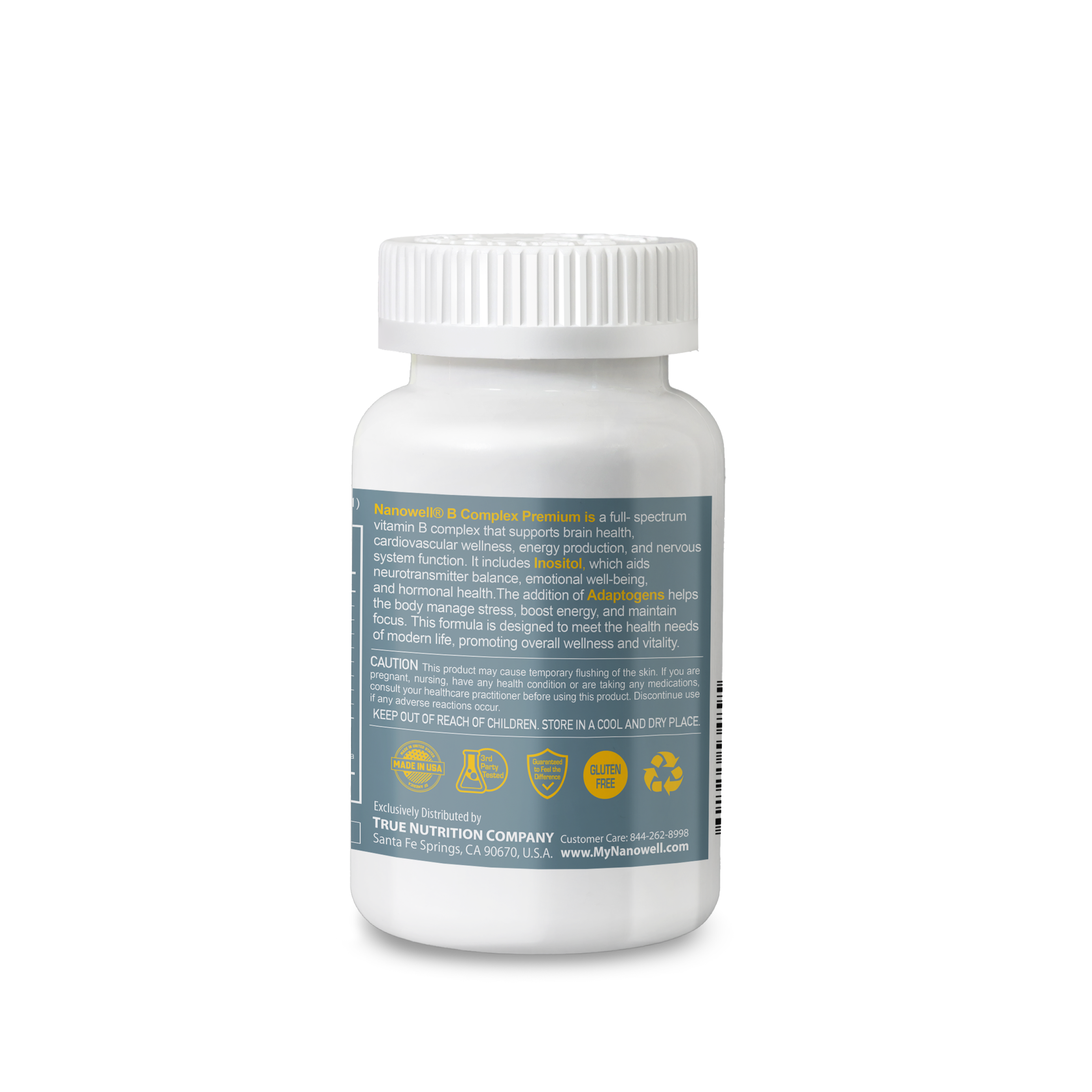 Nanowell B. Complex Premium contains a full spectrum of B Vitamins including Vitamin B1, B2, B3, B6, Folic Acid, B12 Biotin, Pantothenic Acid. This formulation helps to support a wide range of health functions and promote overall wellness.
