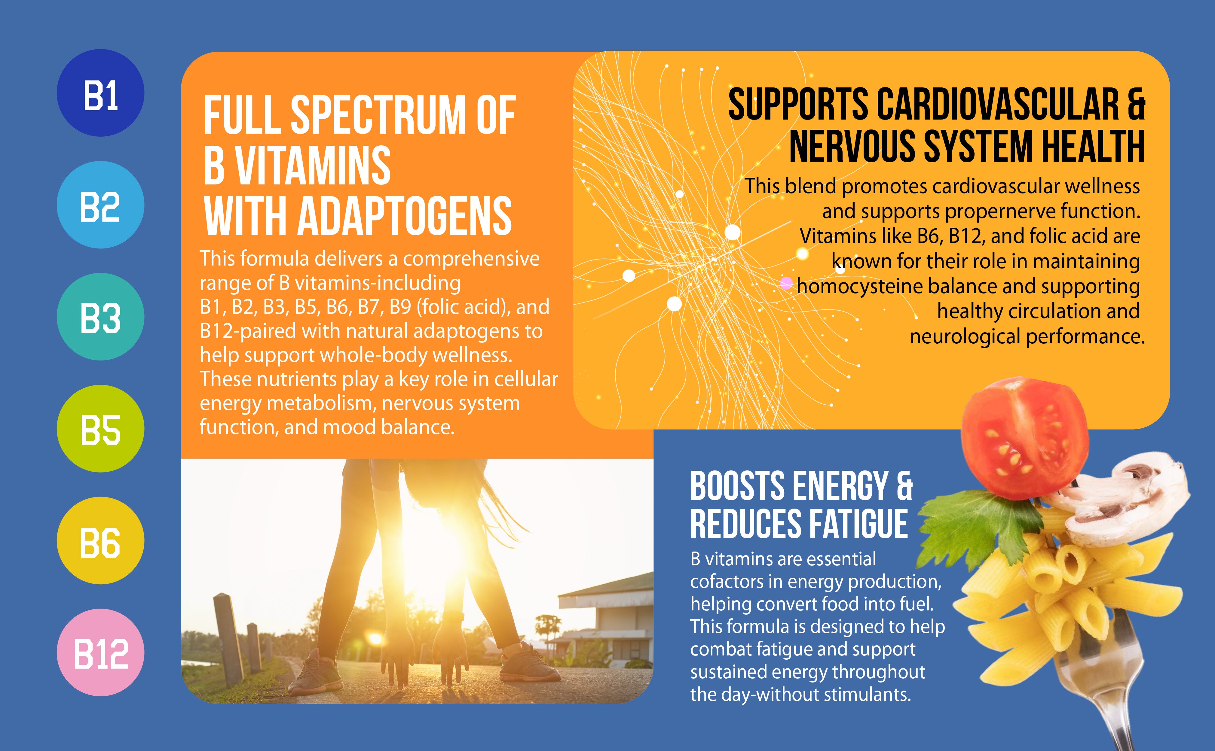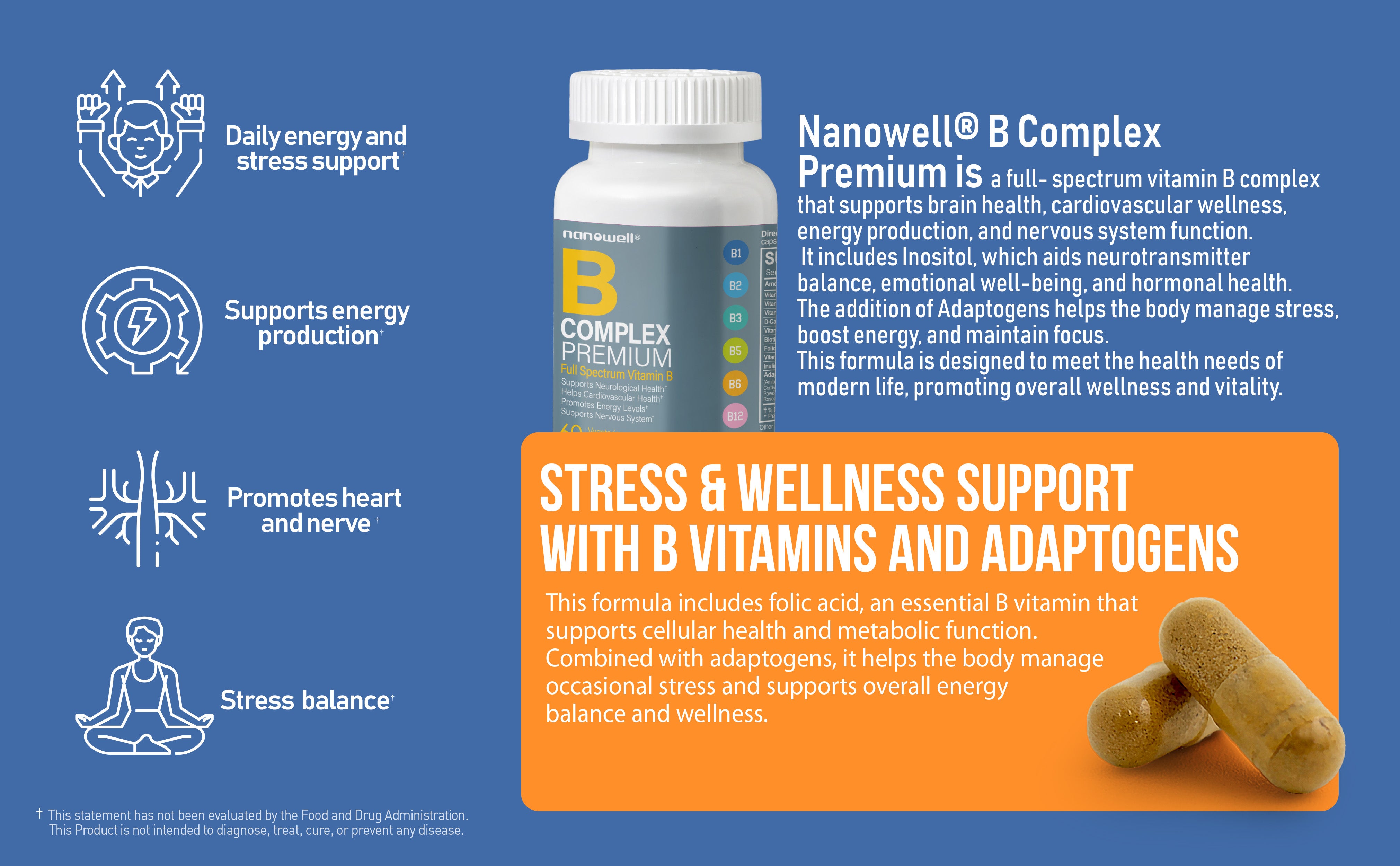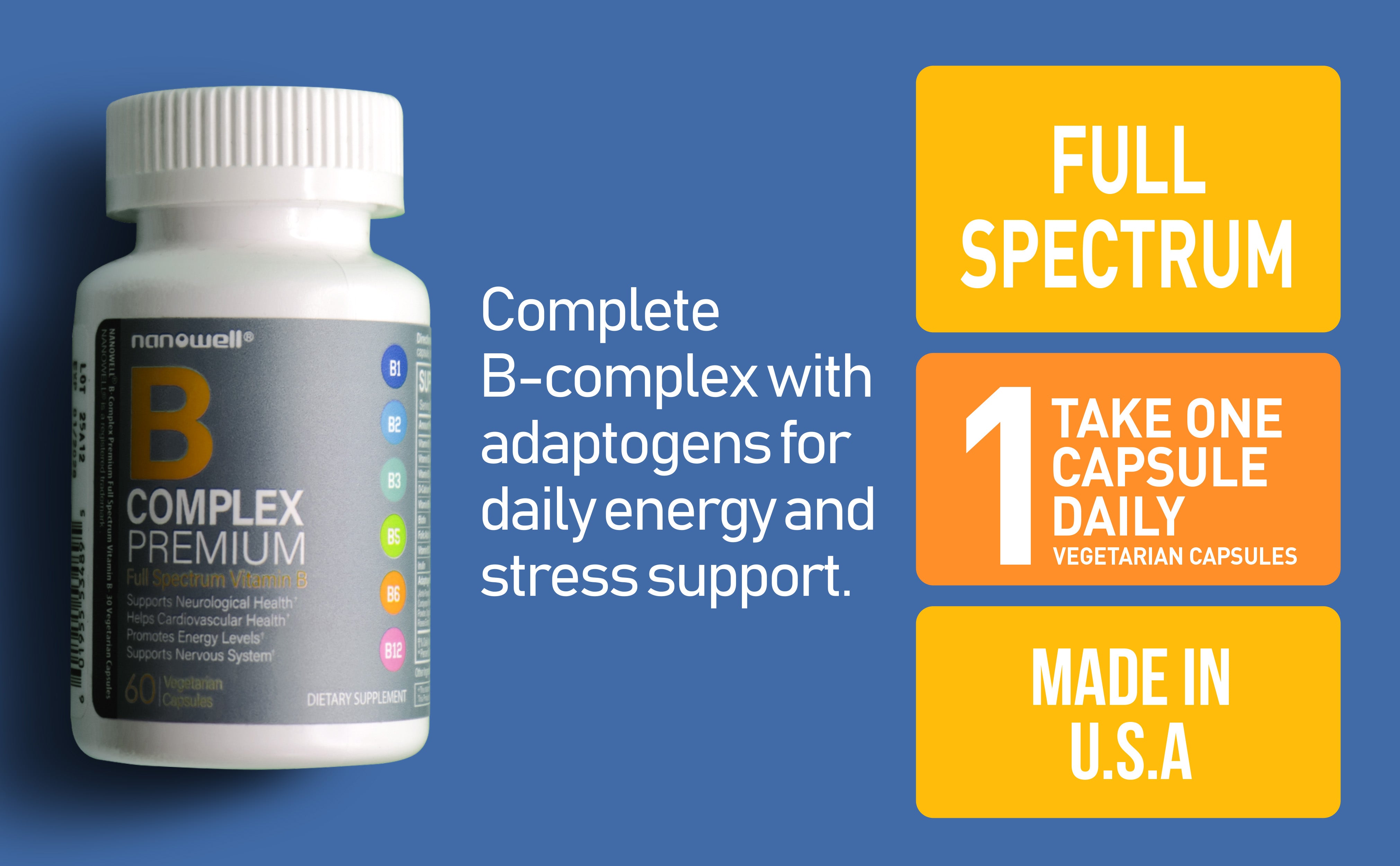 Nanowell B. Complex Premium contains a full spectrum of B Vitamins including Vitamin B1, B2, B3, B6, Folic Acid, B12 Biotin, Pantothenic Acid. This formulation helps to support a wide range of health functions and promote overall wellness.
