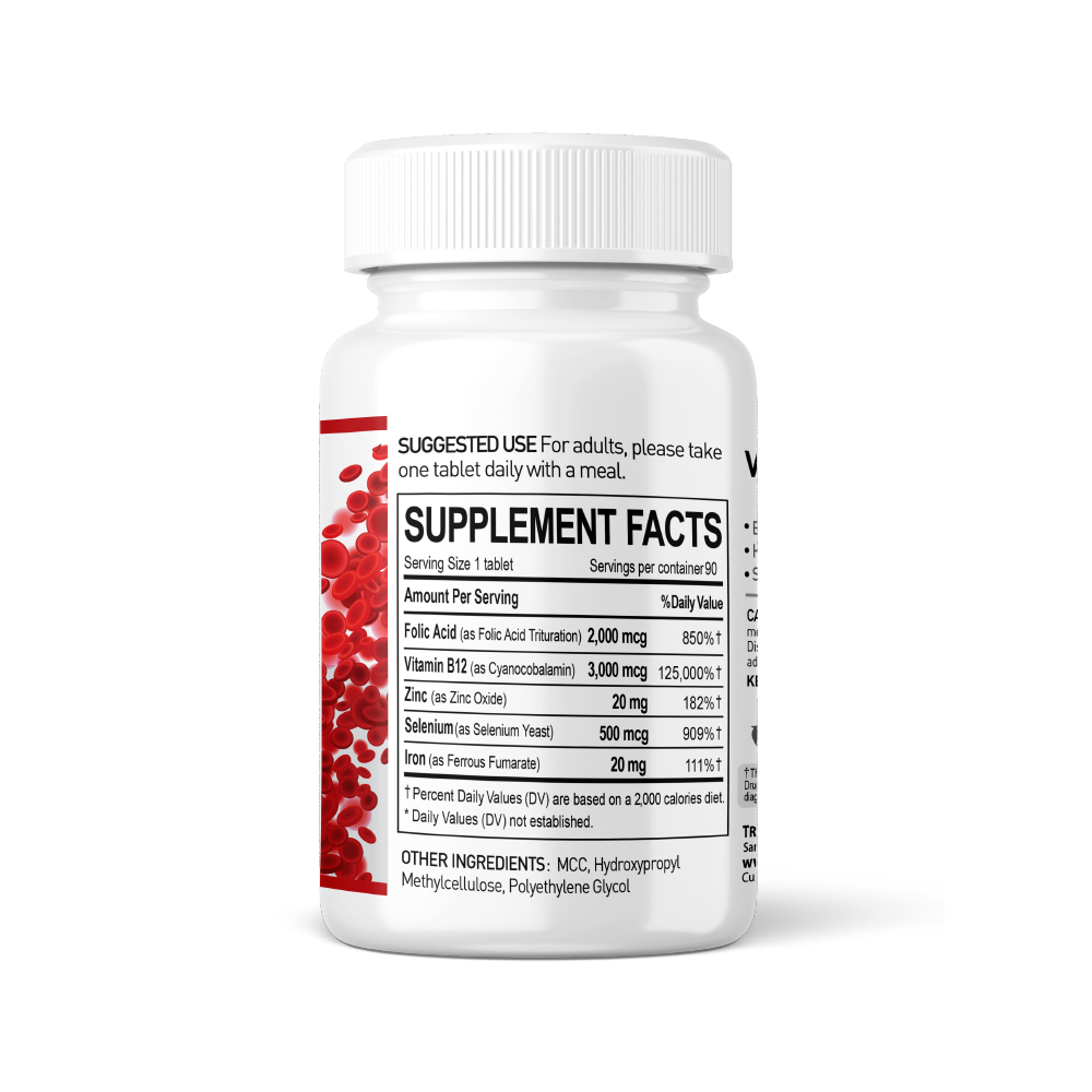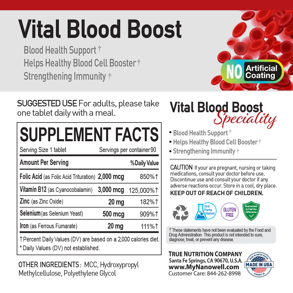 · Our blood boost supplement contains 20 mg Iron, 2,000 mcg Folic Acid, 3,000 mcg Vitamin B12, 20 mg Zinc and 500 mcg Selenium which are essential for blood production, cellular health, energy metabolism, and overall health.
