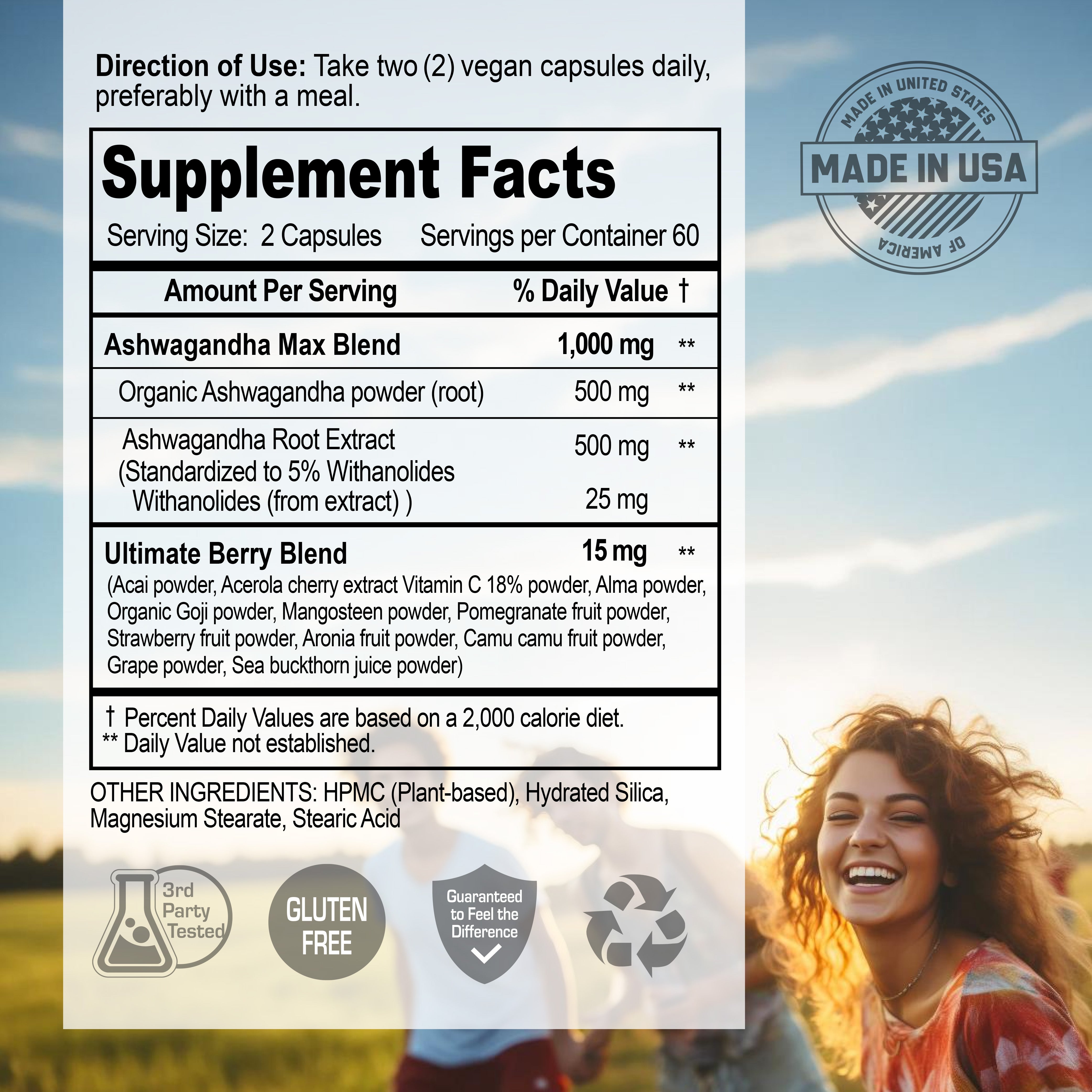 This formula features organic ashwagandha powder and a potent root extract, enhanced with the Ultimate Berry Blend, which provides a rich variety of berry and fruit extracts.