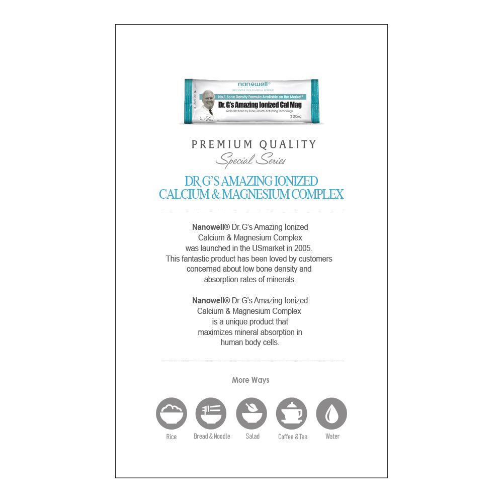 Experience the No.1 Bone Density Formula Available on the market* with Amazing Ionized CalMag Powder Stick Box. Boasting a remarkable 99.99% Absorption Rate, this product contains Ionized Calcium & Magnesium, designed to support your overall health.