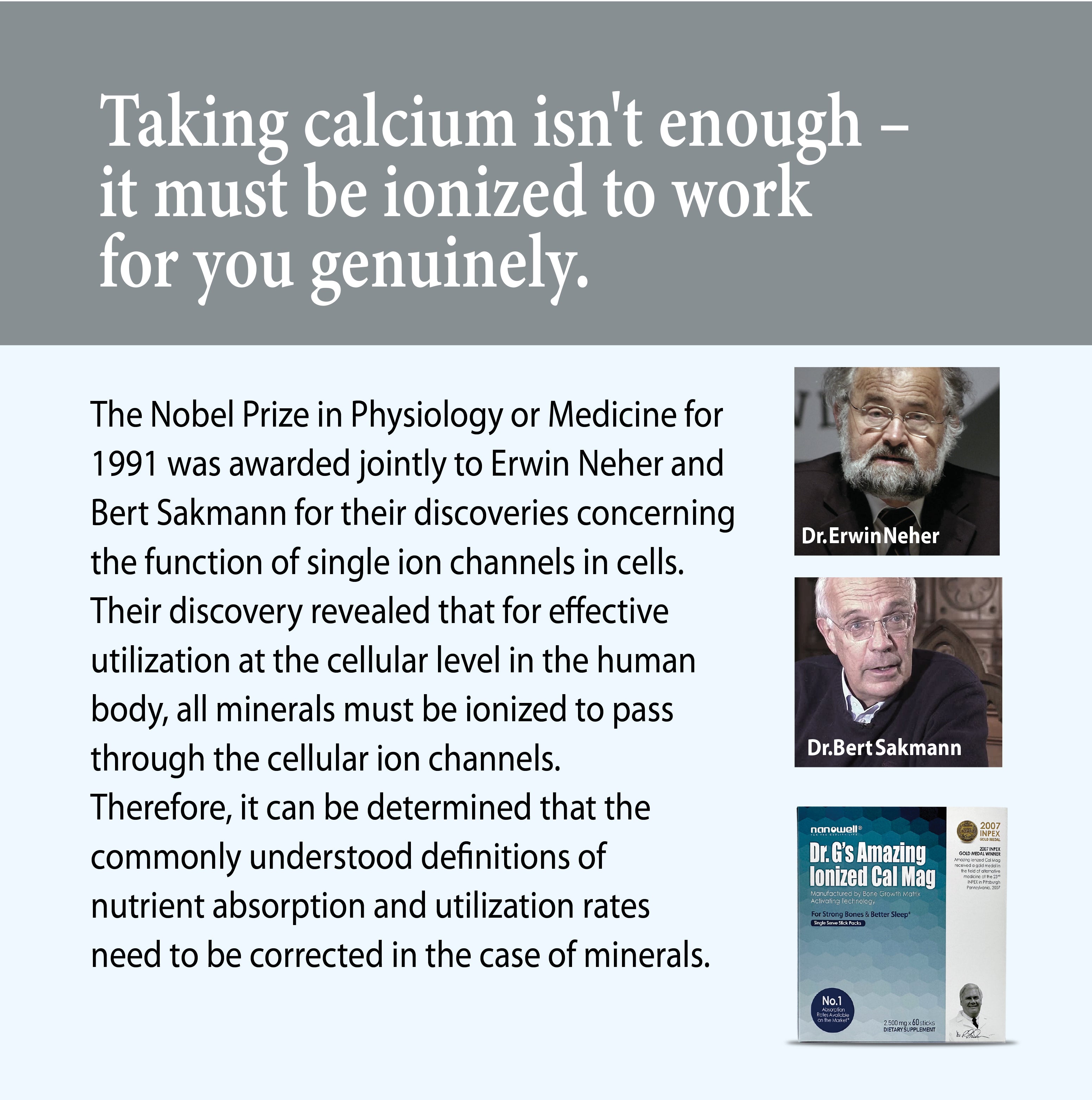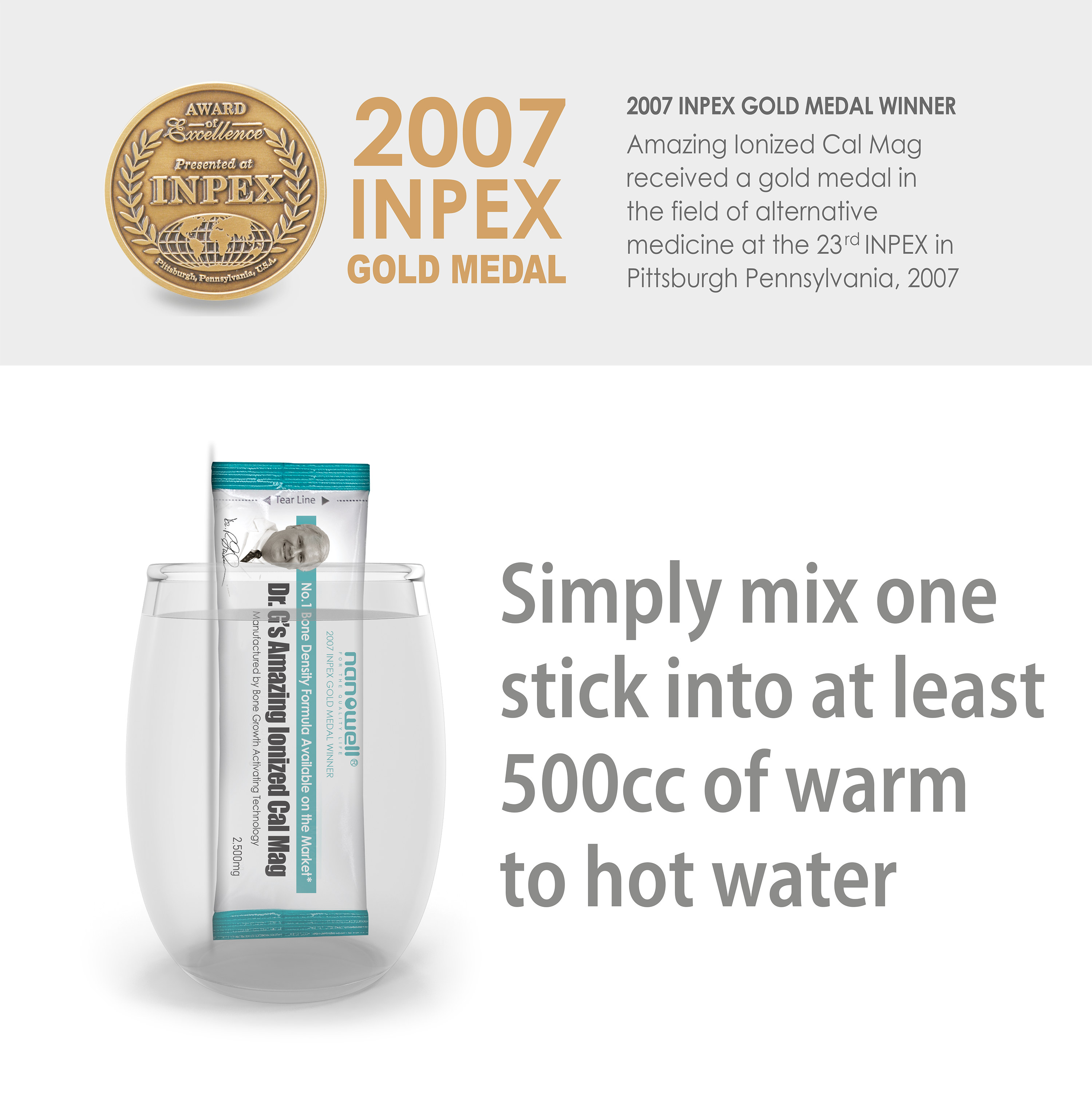 Amazing Ionized CalMag received a gold prize in the field of alternative medicine at the 23rd INPEX Fair in Pittsburgh, Pennsylvania, 2007.