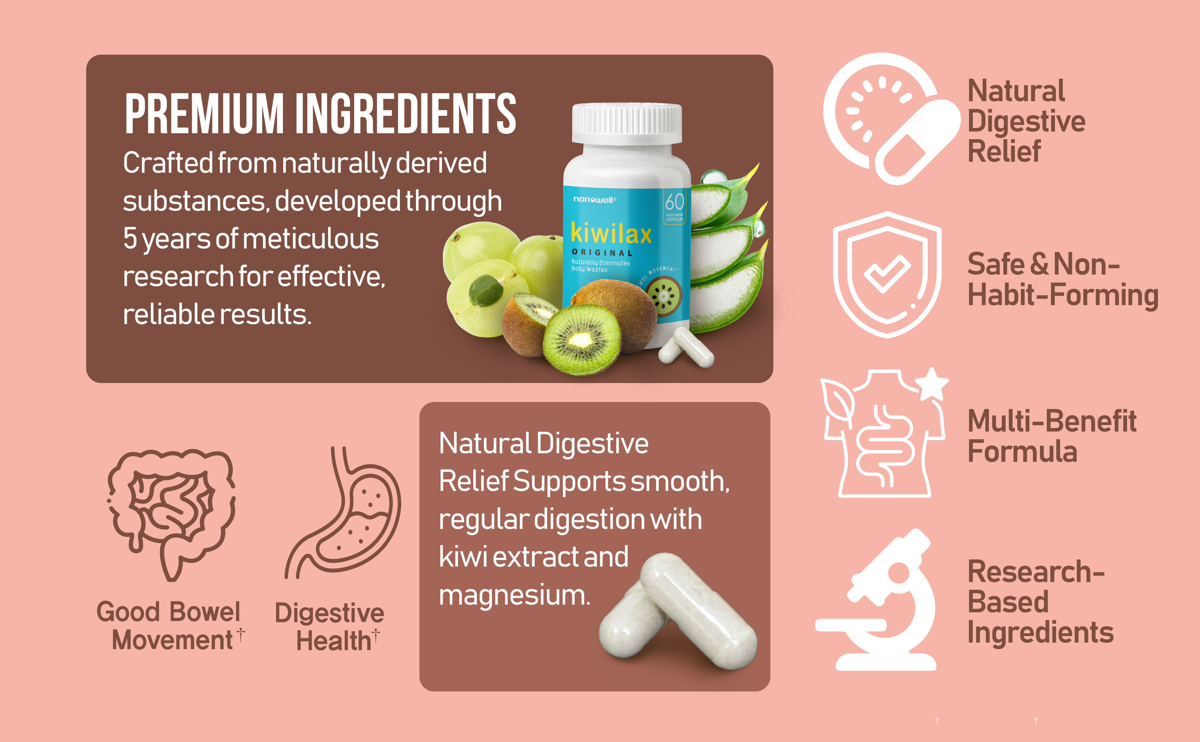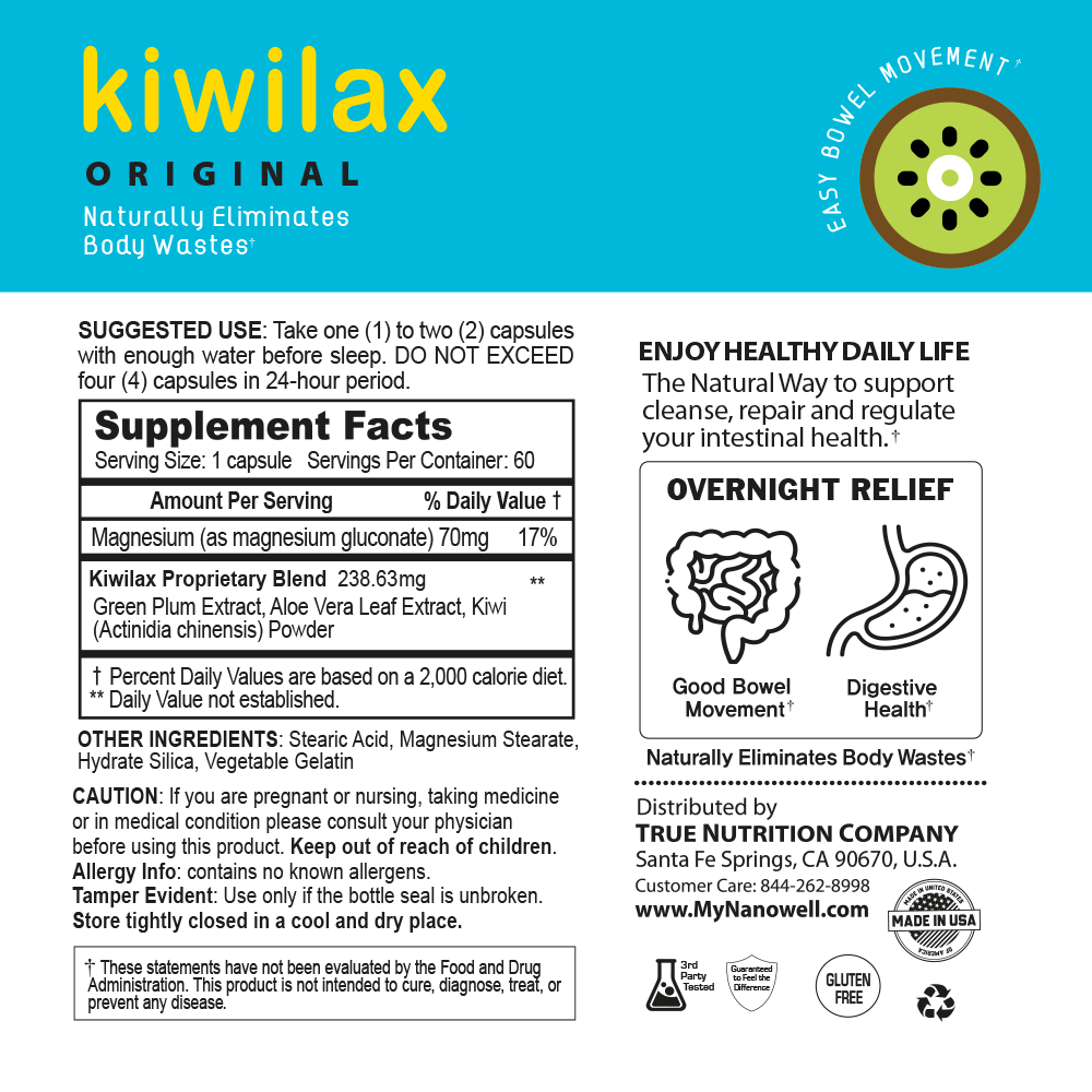 Nanowell® Kiwilax Original contains ingredients from all naturally occurred substances. This unique formula has created from the results of 5 years of studies since 2009 for more comfortable and safe bowel movement remedy using all natural materials.