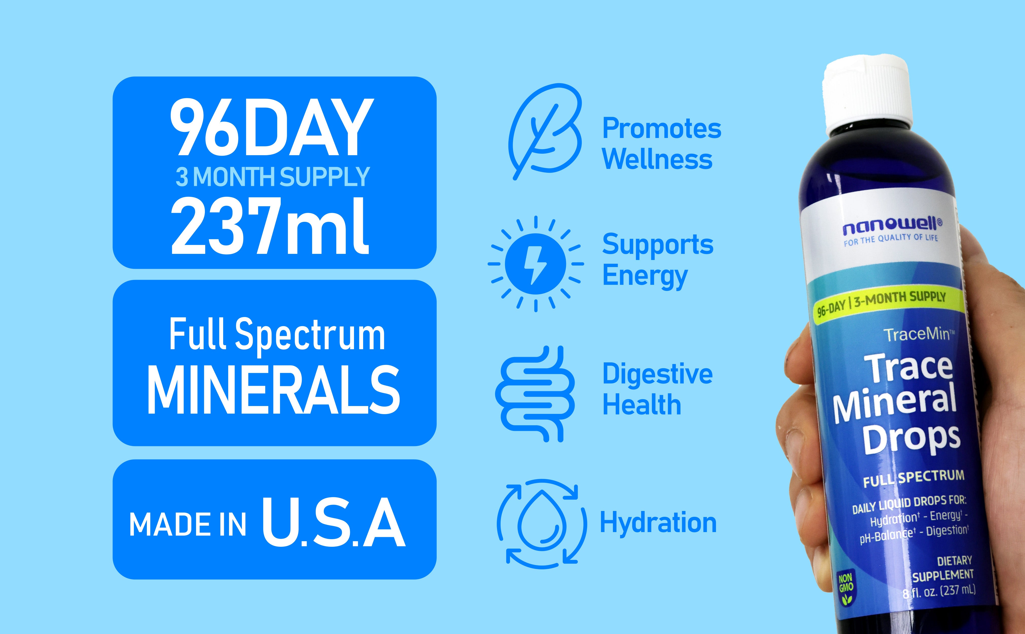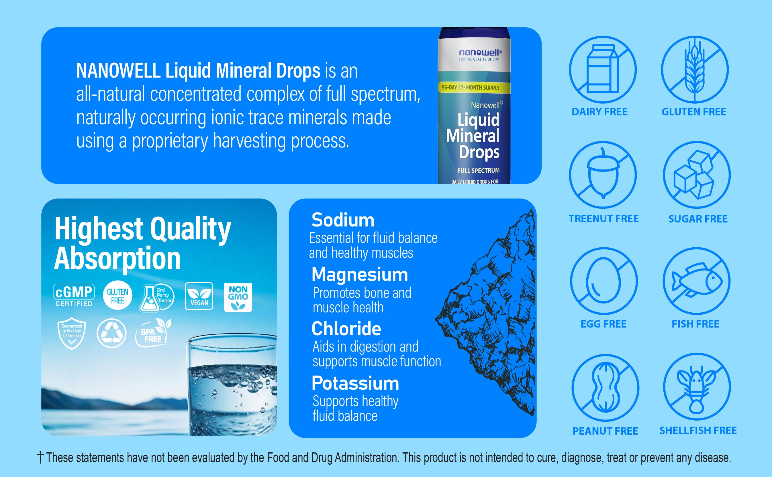 Nanowell Liquid Mineral Drops is an all natural concentrated complex of full spectrum, naturally-occurring ionic trace minerals.