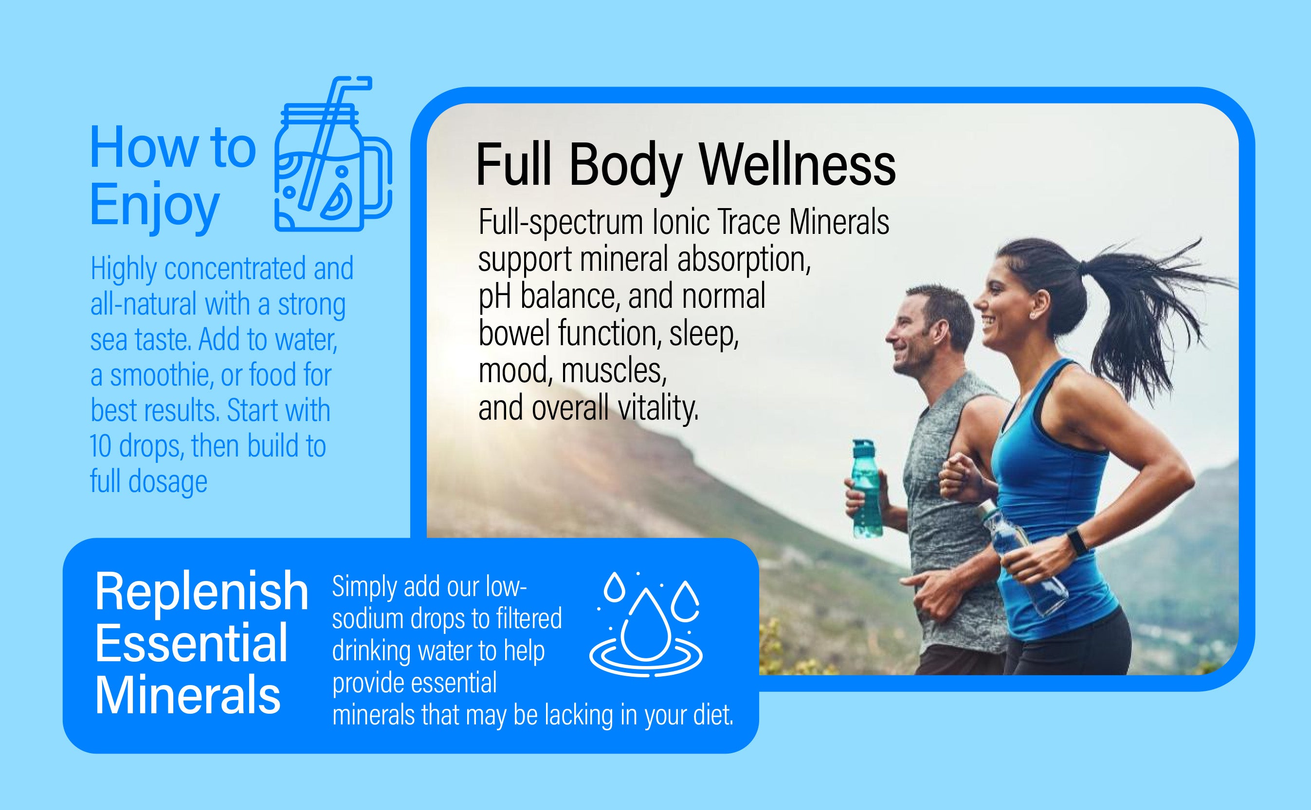 Re-mineralize Water: Improve the flavor of distilled or purified water. Adding 3-6 drops per glass compares to expensive mineral water. Minor crystallization may occur, but this does not affect the quality of the product.