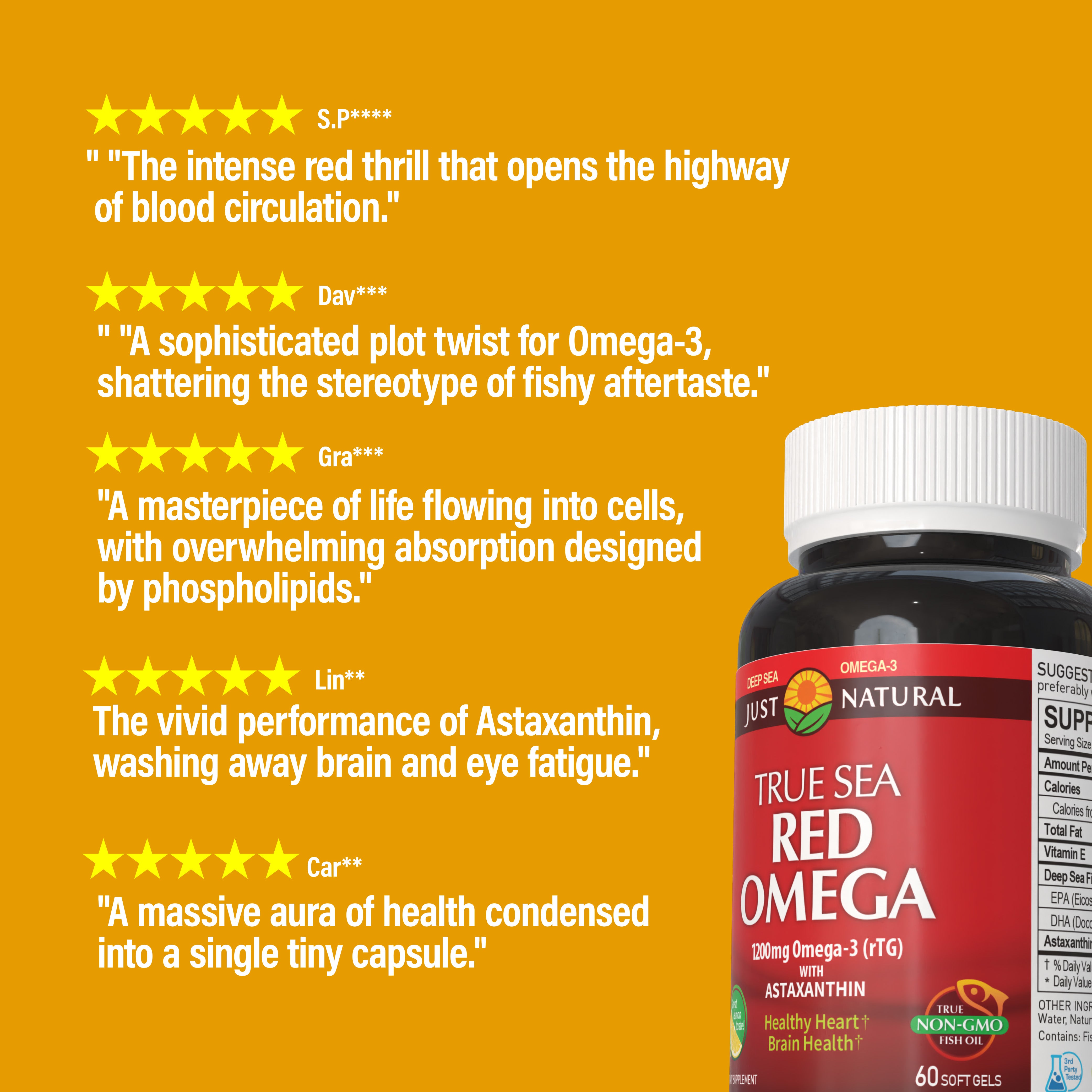Purity Guaranteed Every batch of Just Natural fish oil is crafted from deep-sea fish oil(anchovy) in rTG form. Just Natural is committed to using only non-GMO ingredients; Gluten and Diary Free; No Artificial Colors or Preservatives.