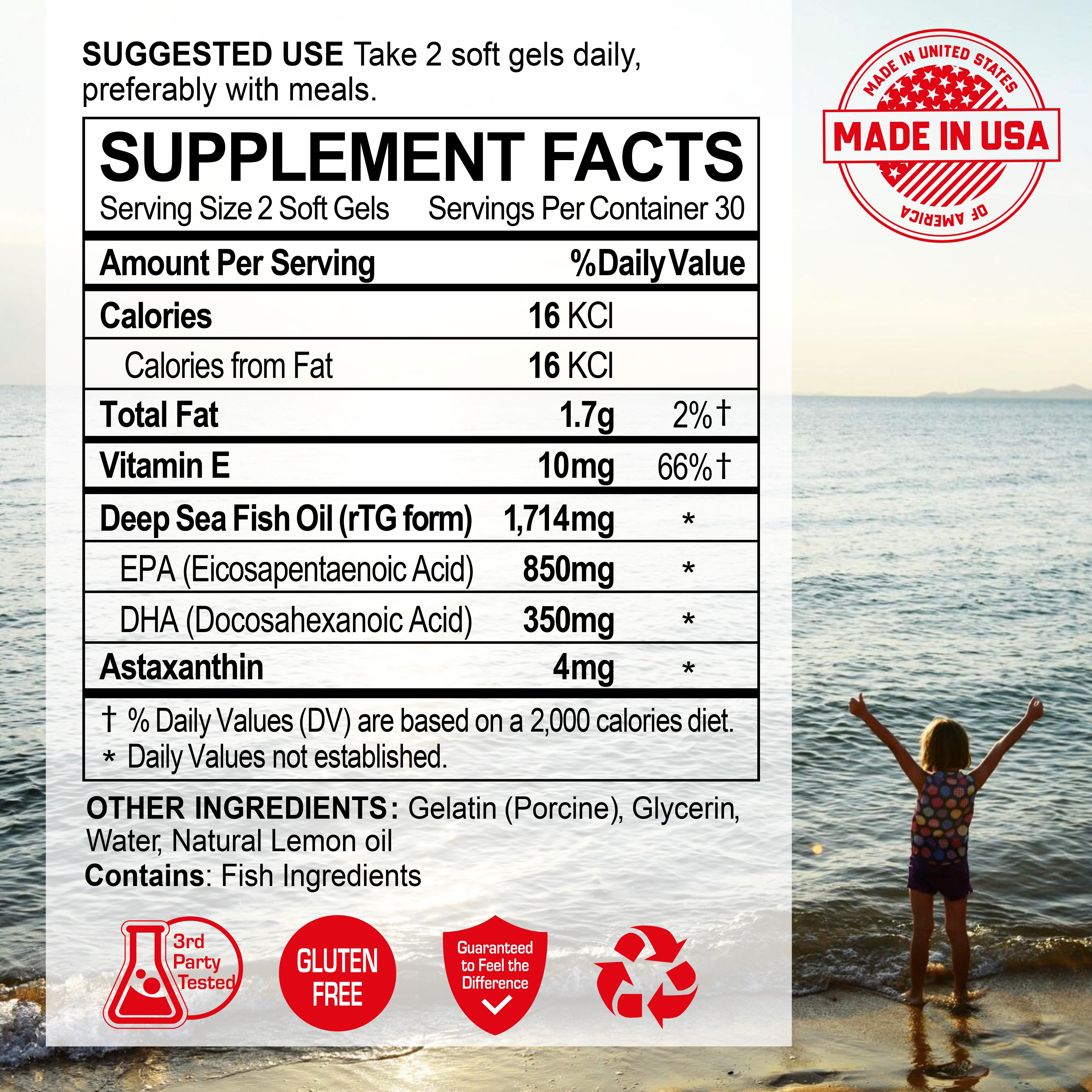 Americans as a population do not eat that much seafood. Given how toxic the oceans and rivers have become with runoffs, heavy metals, and other toxins, that may not be a bad thing. However, that also means that people are not getting enough essential oils like omega 3, DHA, and EPA. That is because an excellent source of these essential oils come from aquatic life.This supplement has the essential oils as well as the red anti-oxidant Astaxanthin which comes from algae. Overall, this is a good formulation containing re-esterified triglyceride (rTG) form of omega-3 that is more bioavailable than traditional fish oil. That also means that it is better tolerated with fewer gastrointestinal side effects for those with sensitive stomachs.Beware, the gelatin pills are the large ones. Wish they made these in micro gels. Overall, we all need essential oils and supplementation may be one of the safer way to get it.I gives this product 3.5 stars. A half star is deducted since the company does not provide specific details in how their product is made. For example, how did they purify out the heavy metals and other toxins from the source?