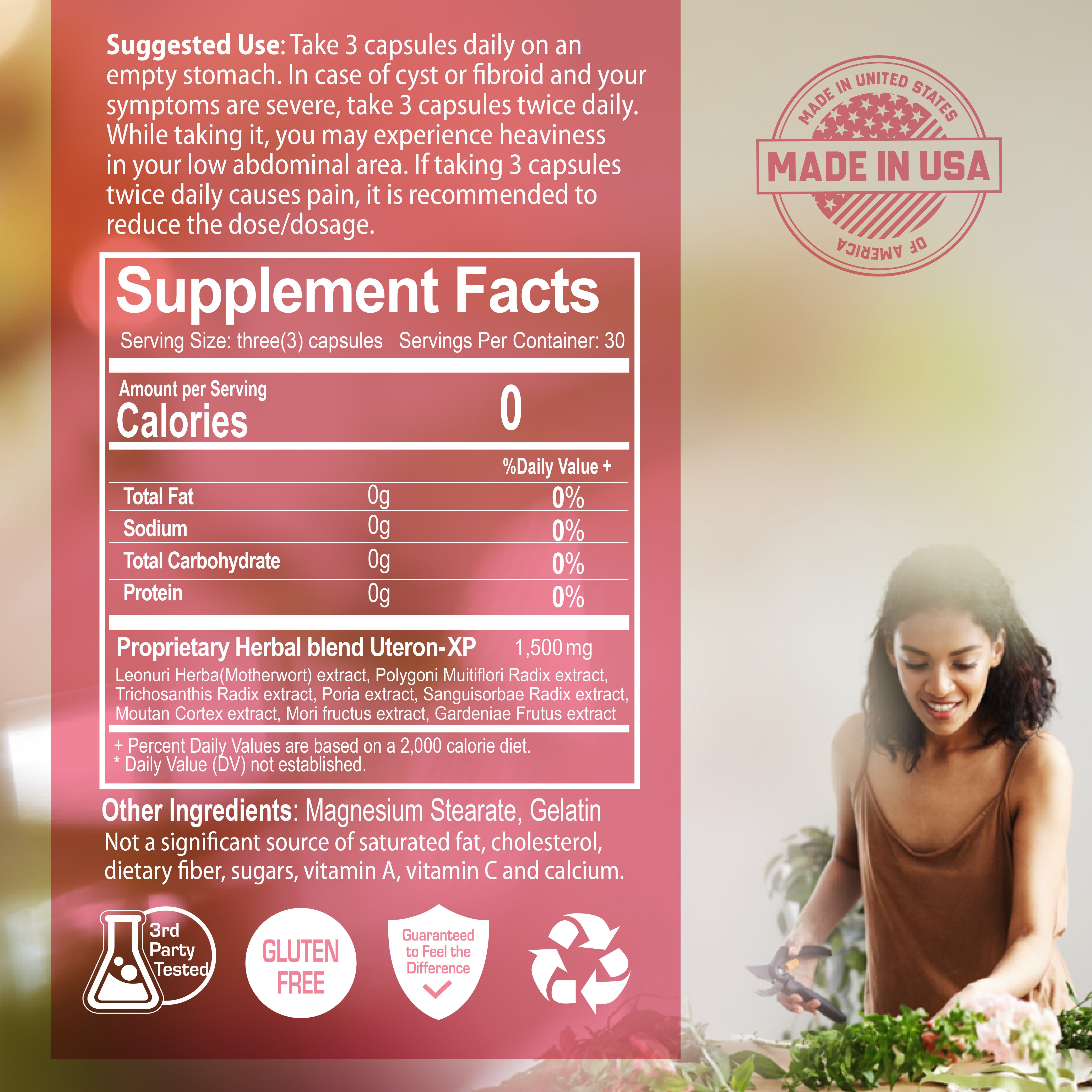 Uteron® is designed for women's health. Women's health begins from uterus health.* Uteron may promotes blood circulation and help cleansing out wastes from uterus.* All natural herbal suppliment for uterus health.* Uteron-xp is for women who have no pains in her menses.* Caution: This product is designed only for women.