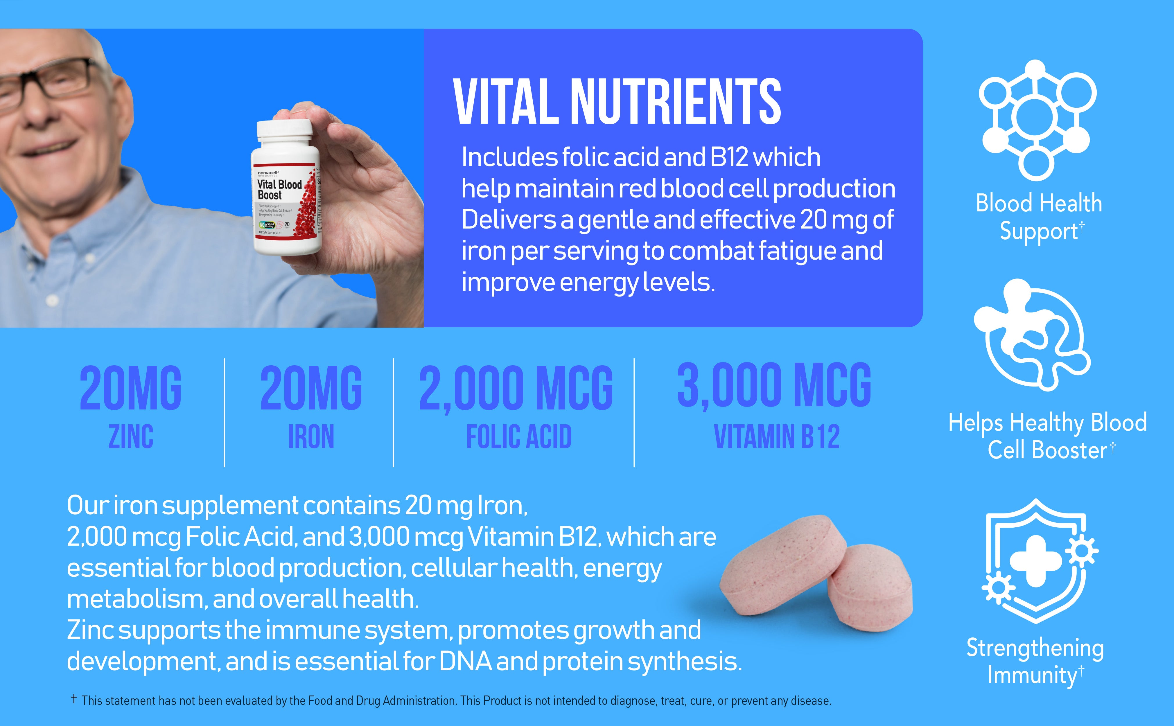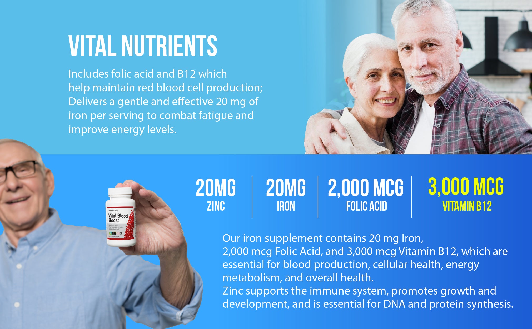 · Our blood boost supplement contains 20 mg Iron, 2,000 mcg Folic Acid, 3,000 mcg Vitamin B12, 20 mg Zinc and 500 mcg Selenium which are essential for blood production, cellular health, energy metabolism, and overall health.